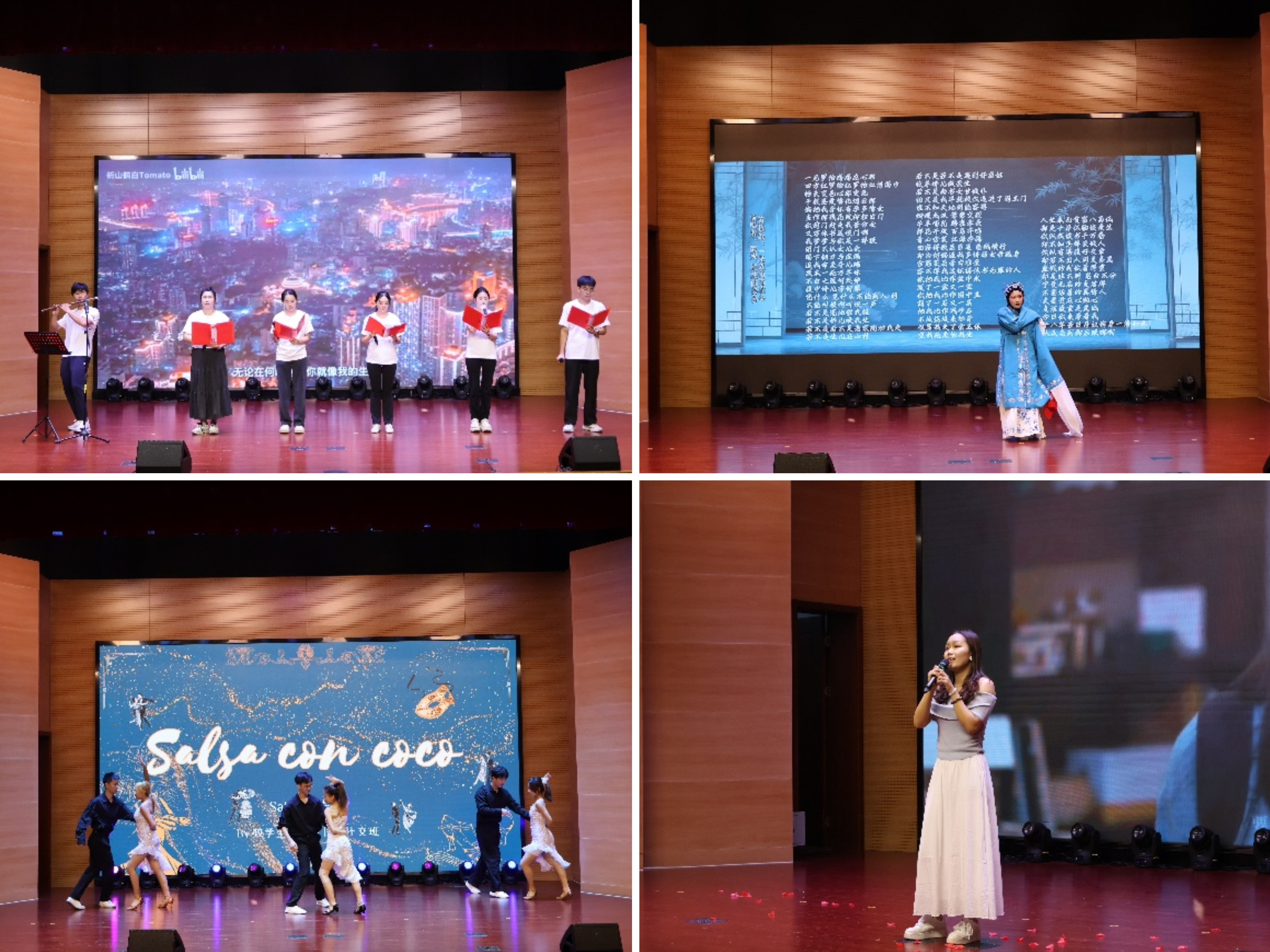 大赛在激昂的合唱《我爱你中国》中拉开帷幕。2024级公共管理班同学以笛声为引,用歌声诠释新时代青年的家国情怀。随后苏妮同学上演的黄梅戏《红罗帕》片段,让现场观众在传统戏曲的韵味中感受文化传承的力量。从传统戏曲到现代舞,从说唱到朗诵,大赛的艺术形式丰富多元,尽显“美美与共”的主题内涵。2024级MPA班的国标舞《salsa concoco》以热烈舞姿展现青春活力。胡雯清同学演唱的《路过人间》,以温暖歌声传递人文关怀,体现法治教育中的人文温度。