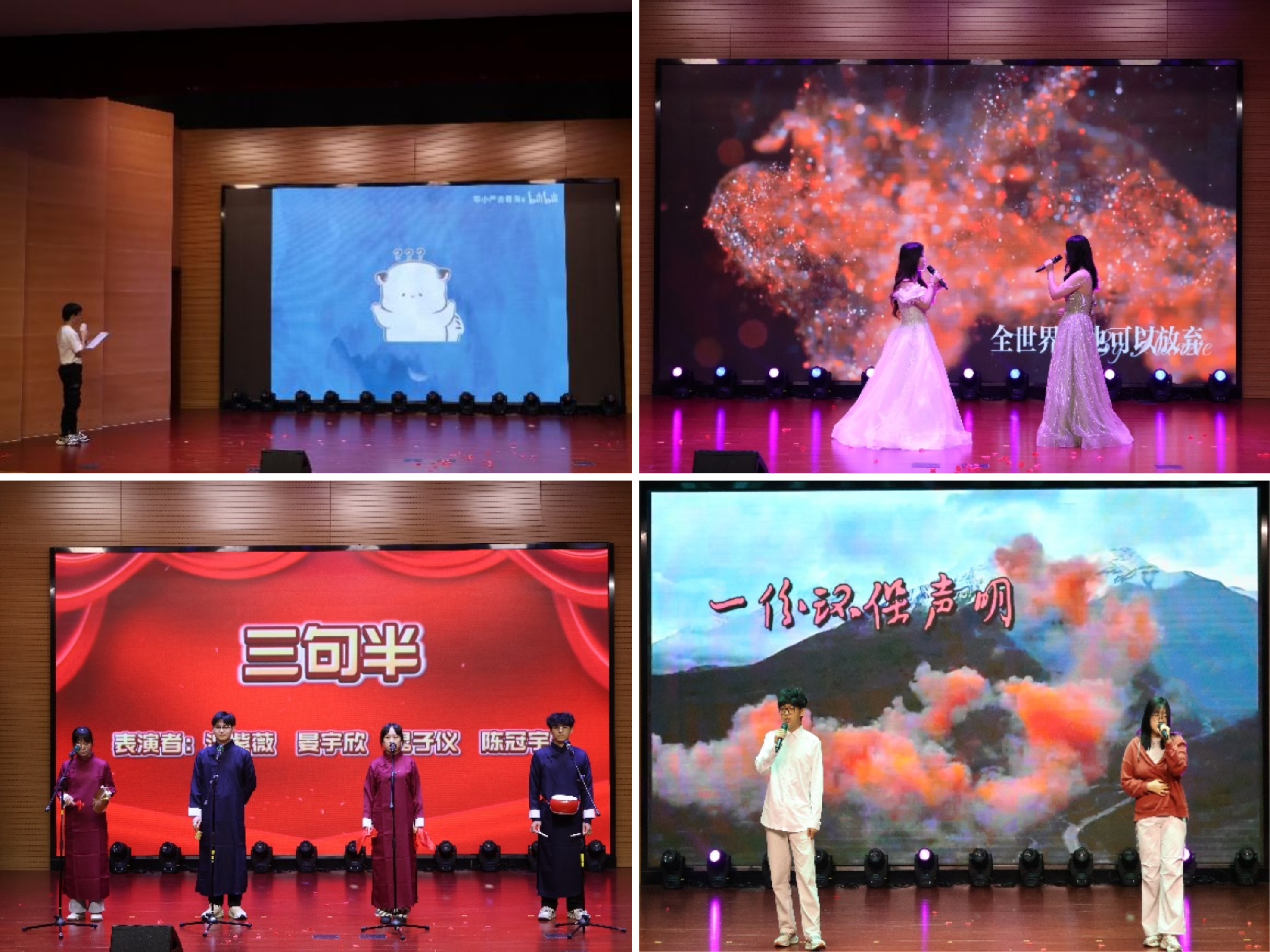 贴近生活的法治节目随之上演。2025级知识产权班的配音表演《声陷“邮”局》,以“官方来电”为场景,让观众在沉浸式体验中学会识别电信诈骗,深化法治防范意识。合唱《至少还有你》带领现场同学感受被爱包围的瞬间,感受平凡生活中的柔光与力量。2024级法律硕士班的《三句半》法治版相声更是将法治主题“接地气”呈现,学子们以诙谐押韵的台词,把专业知识编成相声,让“公平正义”从法律条文转化为鲜活场景。山南说唱社的原创歌曲《共生》则以潮流说唱形式,将“人与自然共生、法治与社会共生”的理念转化为朗朗上口的歌词,展现出青年对时代议题的思考与表达。