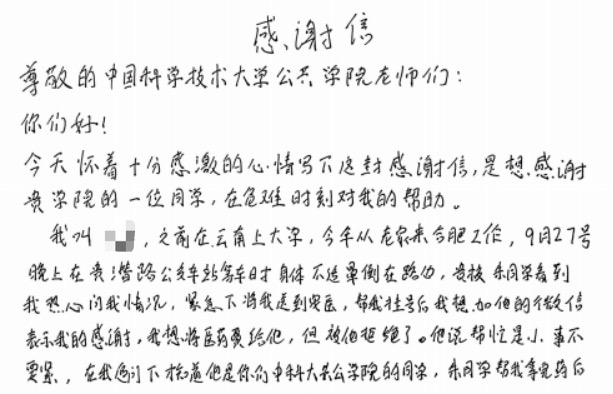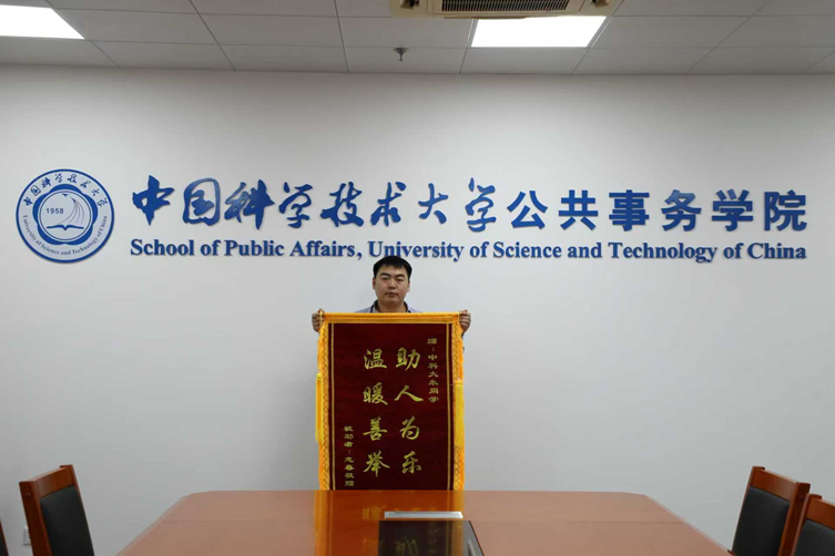 9月27日晚,朱同学途经贵潜路公交站时,发现一名陌生人员因身体不适晕倒在路边。危急时刻,他毫不犹豫地上前施以援手,并第一时间将患者送往安徽医科大学附属医院就诊。在医院期间,朱同学全程陪同,主动帮助挂号、买药,并垫付了医疗费用,使受助者得到及时有效的救治。受助者留观无碍后坚持归还垫付费用,但朱同学婉言谢绝,并在对方追问个人信息时,仅透露自己是中国科学技术大学公共事务学院的一名“朱同学”。事后,受助者经多方打听,专程来到公共事务学院,送来感谢信和锦旗,表达对朱同学深深的感激之情。直到此时,朱同学的善举才被学院师生知晓。
