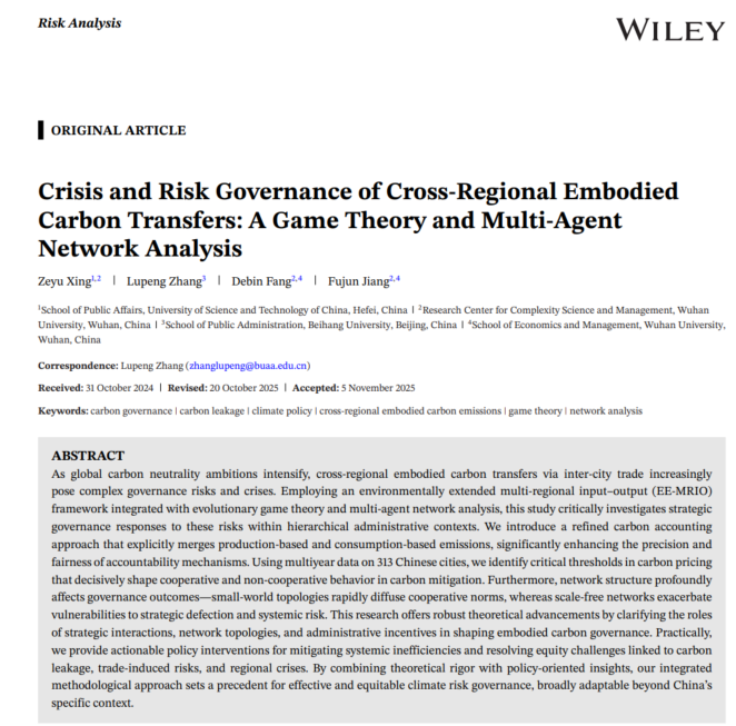 我院邢泽宇特任副研究员与武汉大学方德斌教授等人合作的学术论文“Crisis and Risk Governance of Cross-Regional Embodied Carbon Transfers: A Game Theory and Multi-Agent Network Analysis”在国际风险管理领域权威期刊Risk Analysis上发表。邢泽宇作为本论文的第一作者。