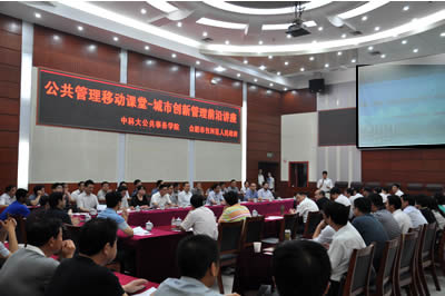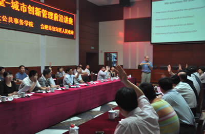 移动课堂由四个专题讲座、互动交流和实地参观合肥滨湖新区建设组成。首先由耿延强区长介绍了合肥市的城市建设历史、发展规划和近年来主要经济指标发展情况,特别是包河区和滨湖新区日新月异的巨大变化;他以包河区城市建设为案例,讲解了区政府如何用城市创新管理理念将包河区规划、建设为经济强区、产业大区和生态文明示范区。