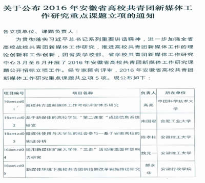 为贯彻落实习近平总书记系列重要讲话精神,进一步加强全省高校战线共青团新媒体工作研究,推进高校共青团新媒体工作的理论创新和工作创新,团省委学校部、省学校共青团新媒体工作研究中心3月至5月开展了2016年安徽省高校共青团新媒体工作研究课题公开招标立项工作。经专家匿名评审,2016年安徽省高校共青团新媒体工作研究重点课题共立项5项。我院分团委副书记高亮博士后申请的《高校共青团新媒体工作考核评价体系研究》(项目编号:16xmtzd01)获得立项资助。 我院团学研究课题的立项,一方面将有力推进我院团学工作的理论研究和内涵提升,为做好新形势下团的工作提供研究基础和理论支撑;另一方面将准确把握、及时跟进青年工作发展趋势,进一步研究新情况、解决新问题,找准群团工作的切入点和着力点。 近年来,我院不断深入贯彻中央群团工作会议精神,提高团学工作科学化、信息化水平,调动团学干部参与团学工作理论研究的积极性,大力支持和鼓励我院团学干部围绕中央群团工作部署、学校综合改革等议题开展专题研究,形成具有一定实践价值和指导意义的理论成果。 ![]() 中国科大公共事务学院 2016-06-12 |