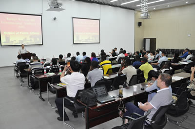 9月7日下午,我院2016级留学生新生开学典礼在中国科大先进技术研究院综合主楼未来中心三楼会议室举行。我校国际合作与交流部蒋家杰副部长,我院宋伟院长、李晓纲书记、周兴国院长助理、刘桂建教授、孙启贵副教授、彭小宝副教授、国际合作部刘颖华主任、研究生办公室宋小燕主任、国际商务中心张学和副主任,以及部分师生代表与全体留学生新生共同参加了本次开学典礼。会议由宋伟院长主持。 宋伟院长在欢迎词中表达了对全体留学生新生的诚挚祝贺及热烈欢迎。他向与会留学生们介绍了我校的发展情况,并重点介绍了我院的教学与研究领域、学术活动及师资力量等基本情况。他勉励留学生们尽快融入中国科大及公共事务学院的学习氛围中,学好专业知识、领略中华文化,做到理实交融、学以致用,积极成为传递中外友谊、促进科技和文化交流的使者。 我院孙启贵副教授作为教师代表发言。他希望留学生们积极学习中国文化和语言,多与导师和同学们交流,并制定明确可行的目标,掌握学习方法和技能,不断提升个人综合素质,充实在中国的学习科研之旅。 蒋家杰副部长代表我校国际合作与交流部对留学生们的到来表示真诚的欢迎。他结合自己的旅美求学经验,与大家分享了在中国科大留学的比较优势和注意事项等。同时,他特别肯定和赞扬了我院在校国际交流与合作中所做的努力和贡献,希望留学生们能尽快融入校园,学有所获。 我院研究生会主席王默同学代表院研会发言。他鼓励留学生们充分利用我校及学院提供的学习资源,多与中国学生交流学习,积极参加校园活动,传播中外文化,并祝愿留学生们都能通过不懈的努力实现自己的理想。 来自也门的留学生Mona Abas Salim作为老生代表发言。她向全体留学生们分享了自己在科大的求学经历和心得感受,希望留学生们能够珍惜在科大的求学机会,把握现在,逐梦未来。 来自巴基斯坦的留学生Asad Abbas也在会上发言,他向全体留学生们简述了自己研究生阶段在科大求学的心得体会和取得的科研成果。作为一名博士生,他希望自己能再接再厉,与在座的留学生新生们共同努力,在收获知识和友谊同时,积极为科大和学院争光。 刘颖华主任向全体留学生新生们了详细介绍了我院学科建设、学术活动、学生活动、学校管理等情况,并提出了对留学生学习和生活方面的要求和期望。她希望留学生能够自觉遵守学校的规章纪律,培养良好的学习和生活习惯,认真努力学习专业知识和技能,提高个人综合素质和核心竞争力。同时,她鼓励留学生积极面对困难和挑战,尽快融入到全新的学习和生活环境中,学院的老师和同学们都将热心为大家提供帮助和支持。 宋小燕主任对教学计划和学位要求做详细说明;张学和副主任演示了学校图书馆公共检索系统的使用方法和技巧;田宇老师详述了在线选课系统及学校、学院官网信息搜索的操作步骤;方园老师介绍了先研院、公共交通和校车安排等生活注意事项,让学生们更快、更好地适应在学校的生活和学习。 ![]() 近年来,随着我校国际化战略的不断推进,我院留学生工作快速发展,留学生数量和质量均稳步增长。我院2016级留学生总数在全校名列第一,呈现出良好的发展态势,他们主要来自巴基斯坦、加纳、坦桑尼亚等“一带一路”沿线国家,经过层层选拔,优中选优,获得了中国科学院、中国国家留学基金委、中国科大奖学金的支持来我院学习深造。 中国科大公共事务学院 2016-09-09 |