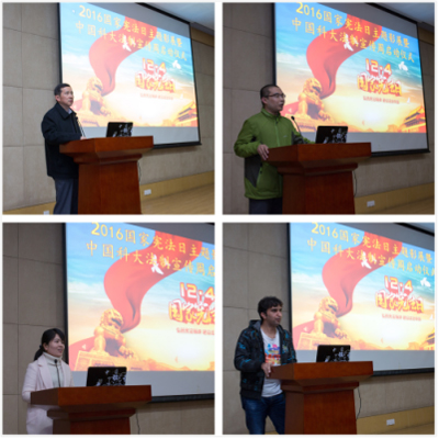 2016年12月4日是我国第三个国家宪法日,也是第十六个法制宣传周,为引导全校师生弘扬法制精神,普及宪法法律知识。公共事务学院于在12月4日上午十点起在校园内开展了以“弘扬宪法精神,建设法治国家”为主题的法制宣传教育系列活动。![]() ![]() 中国科大法硕中心主任杨辉老师首先发表讲话。他回顾了我国设立国家宪法日的历史背景以及推动法制宣传教育的意义,并就中国科大法硕中心的基本情况及近些年来所取得的成绩做了介绍。 随后,校友代表张超敏律师发言,她以职业法律人的视角结合生活实际为与会师生上了一堂精彩的法制教育课。留学生会主席,来自巴基斯坦的Munir Khan从他的角度畅谈了他在中国科大学习生活的感受及本次活动的意义。在中国生活的几年中,他感受最深的是中国快速发展及翻天覆地的变化,他认为这些成果恰恰是中国全面推进依法治国所取得的,对其他国家具有极好的借鉴意义。 ![]() 最后,公共事务学院学工部主任王忠平老师宣布2016法制宣传周正式启动,伴随着校歌《永恒的东风》,与会来宾合影留念。 会后,师生们一起观看了宪法日主题电影,法制宣传周启动仪式圆满结束。 我国于2014年设立国家宪法日,旨在于全社会普遍开展宪法教育,弘扬宪法精神。我院已多次承办国家宪法日主题活动,此次活动系首次与校团委、校研究生会联合举办,进一步提升了这一品牌活动的意义与影响力,在全校范围内形成了“学法、懂法、守法、用法”的良好氛围。 中国科大公共事务学院 2016-12-09 |