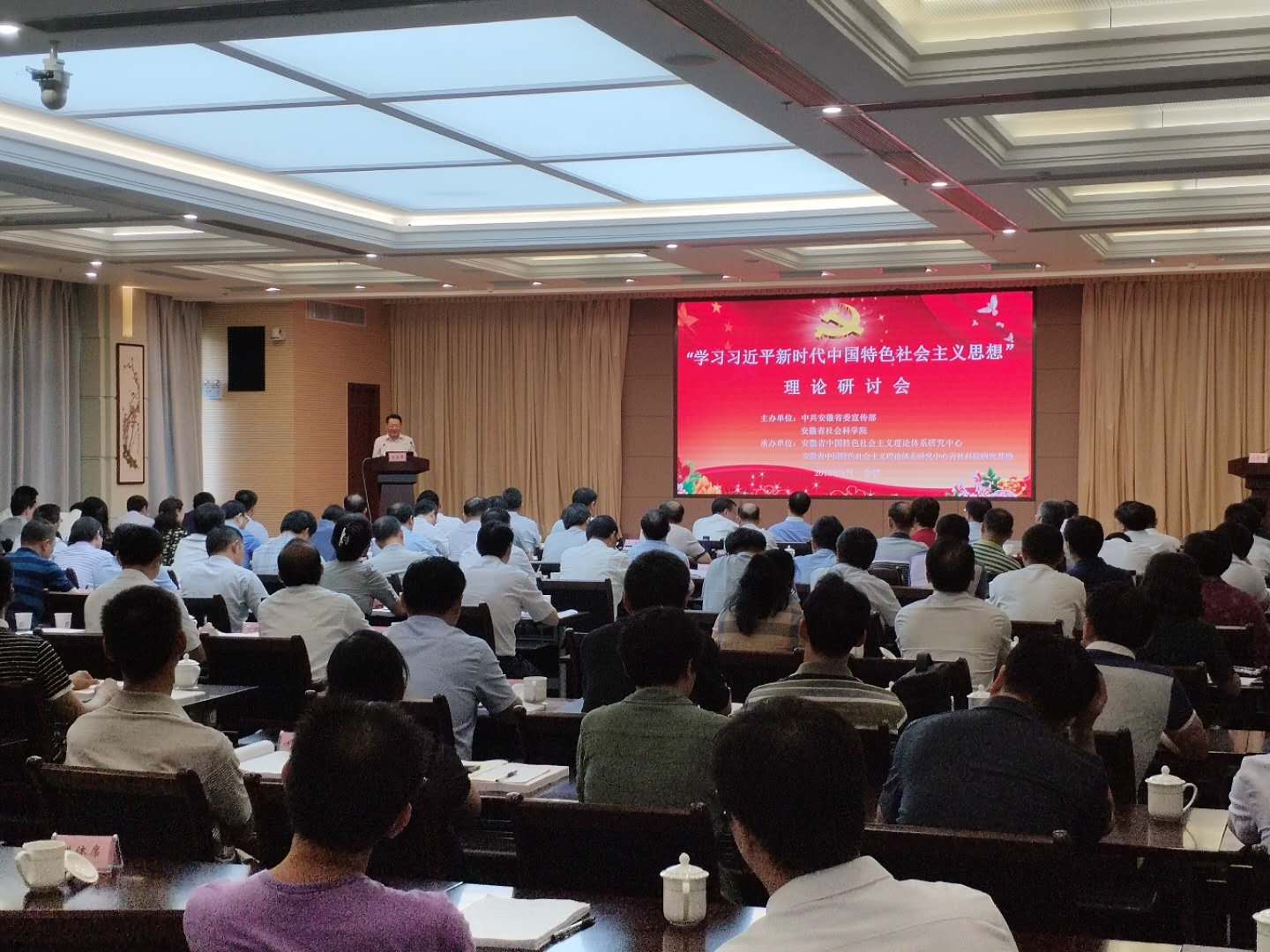 中共安徽省委常委、宣传部部长虞爱华出席会议并讲话,虞部长指出,党的十九大以来,全省上下深入学习、贯彻实施习近平新时代中国特色社会主义思想,推动了习近平新时代中国特色社会主义思想在江淮大地上落地生根,为全面开创现代化五大发展美好安徽建设新局面奠定了坚实的思想基础。来自安徽大学、安徽师范大学、中共安徽省委党校、安徽社会科学院等单位的专家分别从根本方法、历史方位、思想来源等多个角度分享解读了习近平新时代中国特色社会主义思想,会场气氛热烈。