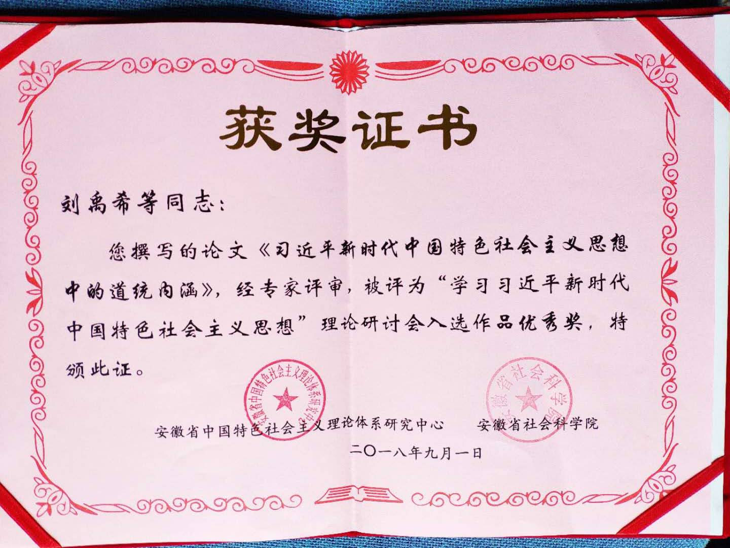 最后,会议公布了获奖论文名单,我院刘禹希同学、王忠平老师完成的《习近平新时代中国特色社会主义思想中的道统内涵》荣获优秀奖。参加本次征文活动的还有阮雪松、康卫敏、梁萍、王韬、吴云鹏、闫鹏飞、鲁静等同学,他们从不同角度探讨学习了习近平新时代中国特色社会主义思想,得到了学校宣传部门的高度肯定。