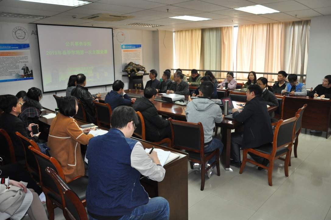 2019年3月13日下午,公共事务学院党委开展了本学期第一次党课培训活动,学院副院长褚建勋同志做了题为“学习理解文化自信”的报告。会议由党委副书记陈晓伶同志主持。
