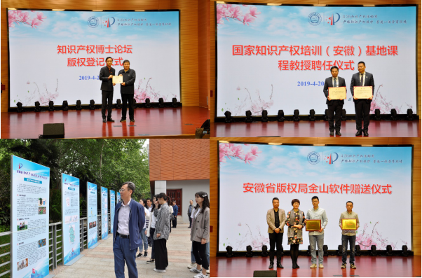 2019年度中国科大知识产权高峰论坛由主论坛与3个分论坛共同组成,内容丰富活泼。不仅有来自不同国家、地区的专家学者围绕知识产权国际事务、知识产权金融生态链等前沿热点问题开展学术交流与思想碰撞。同时穿插各种活动仪式和安徽省知识产权创造运用与保护成果图片资料展览。在“中国科大知识产权博士论坛”版权登记仪式上,我院党委书记李晓纲教授接受了安徽省版权交易中心现场办理的“中国科大知识产权博士论坛”版权登记证书。国家知识产权培训(安徽)基地课程教授受聘仪式上,基地常务副主任周朝生分别向来自知识产权行业内两位实务专家王怀庆律师和韦国律师颁发课程教授聘书。安徽省版权局主办金山软件赠送仪式;安徽省市场监督管理局现场举办安徽省知识产权创造运用与保护成果图片资料展览,内容紧凑充实。