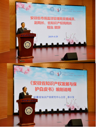 随后,安徽省市场监督管理局党组成员、副局长、省知识产权局局长程胤向参会的来宾和媒体界朋友表示诚挚的欢迎和衷心的感谢,他在讲话中介绍了《知识产权发展与保护状况白皮书(2018)》的相关情况以及安徽省知识产权工作取得的成效,他指出知识产权事业发展需要全社会的共同参与,不仅在行动上积极推进,还要在经验上加深交流。他希望大家充分利用高峰论坛这一重要平台,深入交流,相互启迪,凝聚共识,形成一批知识产权发展的新理念、新思路、新举措,为安徽知识产权事业发展出良策、荐良方,为持续提升安徽省知识产权发展水平贡献更多的智慧和力量。安徽省知识产权研究中心彭小宝主任做《安徽省知识产权发展与保护白皮书》编制说明。这是安徽省首次发布知识产权发展与保护状况白皮书,该白皮书由安徽省知识产权局与中国科大共同编制完成。