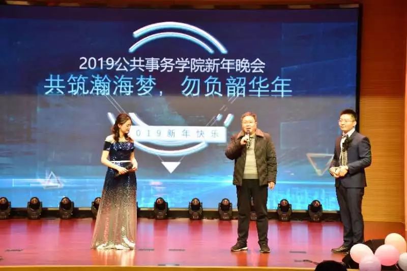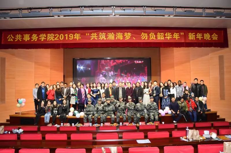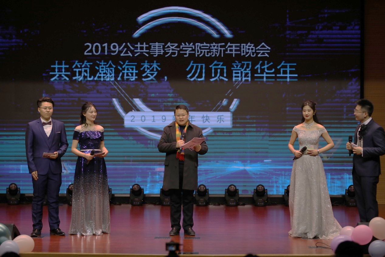 2018年12月28日下午,由公共事务学院党委主办,院团委和院研究生会承办的2019年“共筑瀚海梦、勿负韶华年”新年晚会在东区水上报告厅隆重举行。学院党委书记李晓纲、副院长褚建勋、党委副书记陈晓伶、院长助理周朝生、学工办主任王忠平、法硕中心副主任宋澜、学工助理傅晨以及法硕中心秦洁老师亲临现场欣赏了晚会。
