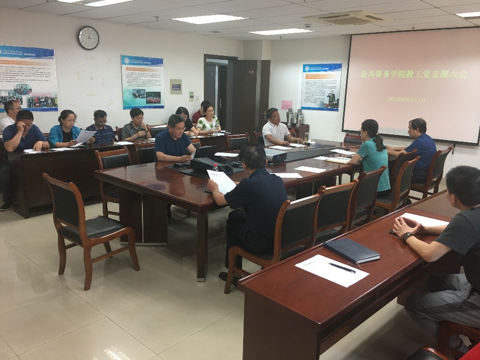 根据党员发展要求,公共事务学院教工党支部于2019年6月11日召开教工党支部大会,讨论教工支部王强、黄胜两位同志预备党员转正以及方桂芹同志发展预备党员相关事宜。会议在管理科研楼1108会议室举行,由教工党支部书记王忠平同志主持。