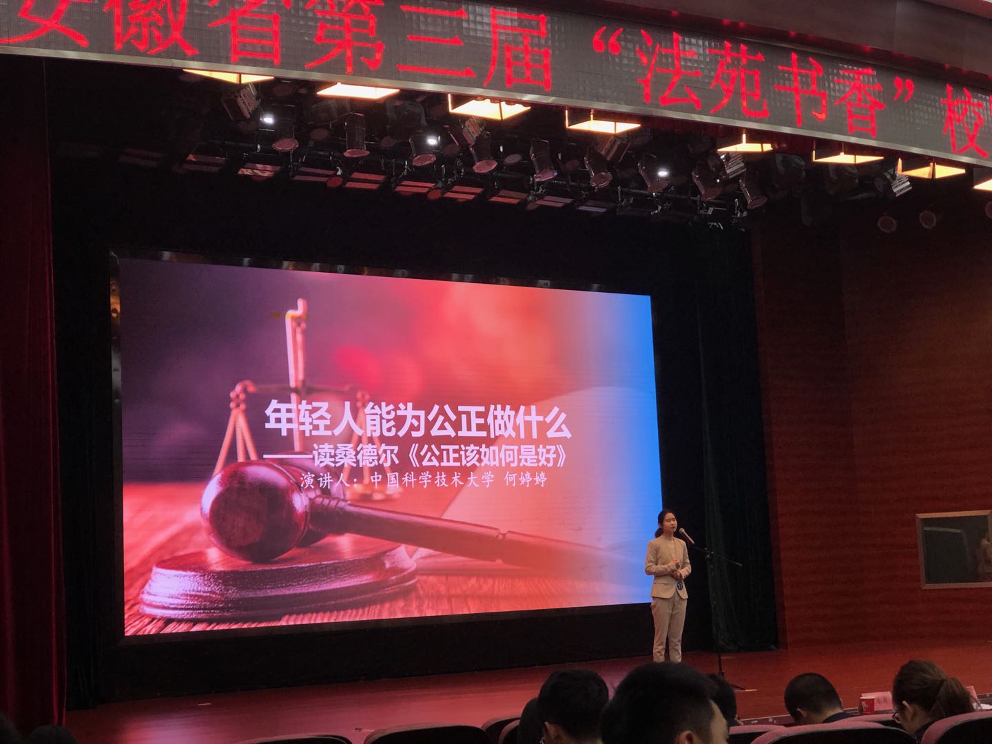 2019年11月15日,安徽省第三届“法苑书香”悦读分享赛在安徽警官职业学院(西区)隆重举行,来自全省19所高校的19名法律专业学生齐聚这里,展开激烈的角逐。我院通过上月举行的“读书知法”校园悦读分享赛的比拼,推荐2018级法律硕士专业的何婷婷代表中国科大参加此次比赛,法硕中心宋澜副主任担任此次比赛的指导老师。