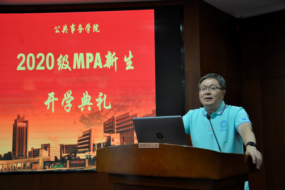 李思敏副院长代表学校和研究生院致辞。他在致辞中简要介绍了我校的发展历程、发展现状和取得的成绩,对我院MPA专业学位教育改革和发展给予了充分肯定。他同时给同学们提出了三点建议:一是在学好专业理论课的基础上,加强政治课、外语课的学习;二是加强实践,提高解决实际问题的能力;三是严格、规范撰写学位论文。