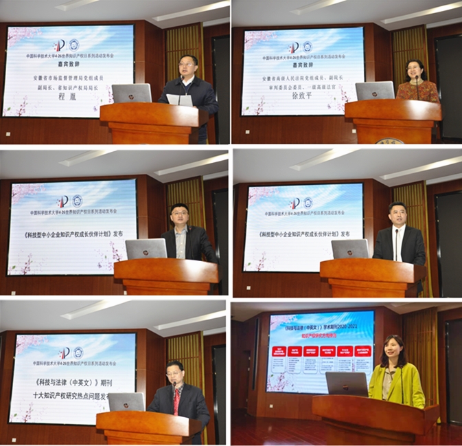 中国科大科技创新与区域发展研究中心主任胡海洋与安徽省律协信息网络与高新技术专委会主任沈国庆联合发布了《科技型中小企业知识产权成长伙伴计划》;《科技与法律(中英文)》杂志编辑部主任许绍定揭晓年度十大知识产权研究热点;公共事务学院副研究员王金金预测发布了知识产权重点研究领域;出席大会的领导为知识产权优秀青年作者颁奖,表彰为知识产权学科发展做出贡献的青年学者。