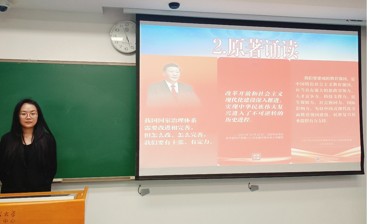 在“原著诵读”环节,组织委员肖瀚湘同学节选了《习近平谈治国理政》第一卷和第五卷中的部分内容,带领全体团员逐字认真诵读。朗朗书声中,同学们沉浸于理论的深邃,感受着经典的力量,在精读原典中更加深刻地认识到了推进国家治理体系和治理能力现代化、进一步全面深化改革以及建成教育强国的历史必然性和现实紧迫性。