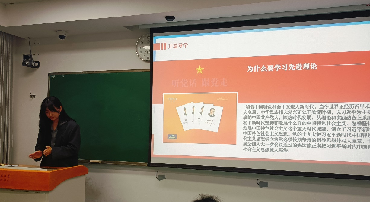活动在团支部副书记彭思雨晨同学精彩的开篇导学中拉开帷幕。她系统梳理了习近平新时代中国特色社会主义思想的主要内容,阐述了“学思践悟新思想”与“知行合一担使命”两者间内在的逻辑一致性。